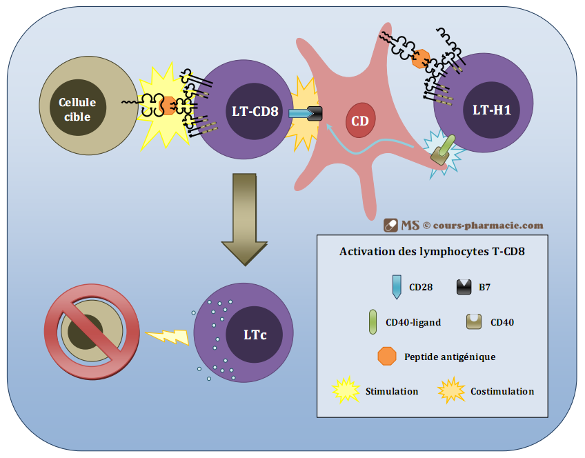 - Des signaux de costimulation, indispensable à une activation totale du lymphocyte, qui sont induit par l’interaction entre le cluster de différenciation CD28 présent à la surface du lymphocyte T-CD8 et le récepteur B7.